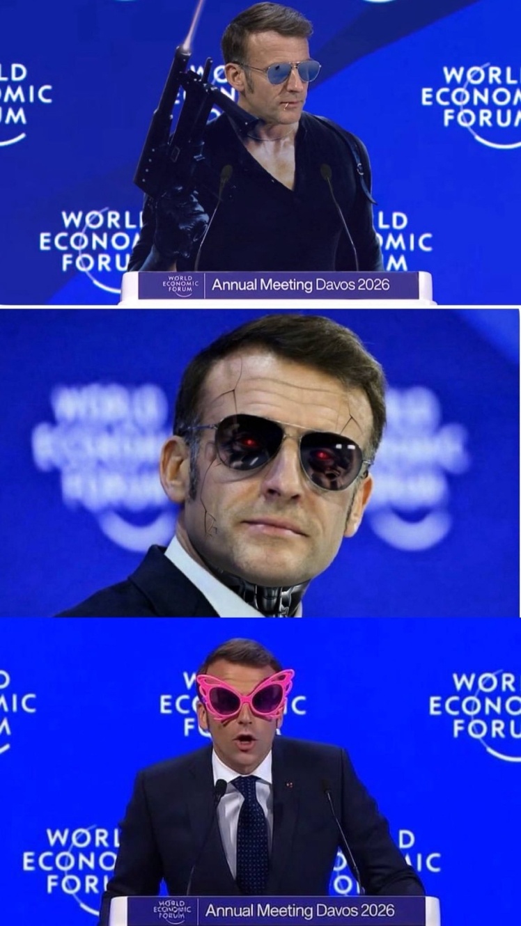 Під час промови на Всесвітньому економічному форумі в Давосі Макрон виступав у дзеркальних сонцезахисних окулярах, хоча захід проходив у приміщенні. Це викликало хвилю мемів і жартів у соцмережах. Частина користувачів порівняли образ французького президента з героями фільму «Найкращий стрілець», «Запах жінки» або «Кобра», інші назвали його вигляд надмірно пафосним і навіть почали спекулювати про стан здоров’я політика.