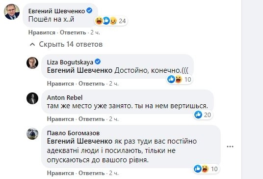 Безгін відповів у Facebook. Шевченка він назвав «ватним клоуном» та «істотою», яка перетнула лінію.